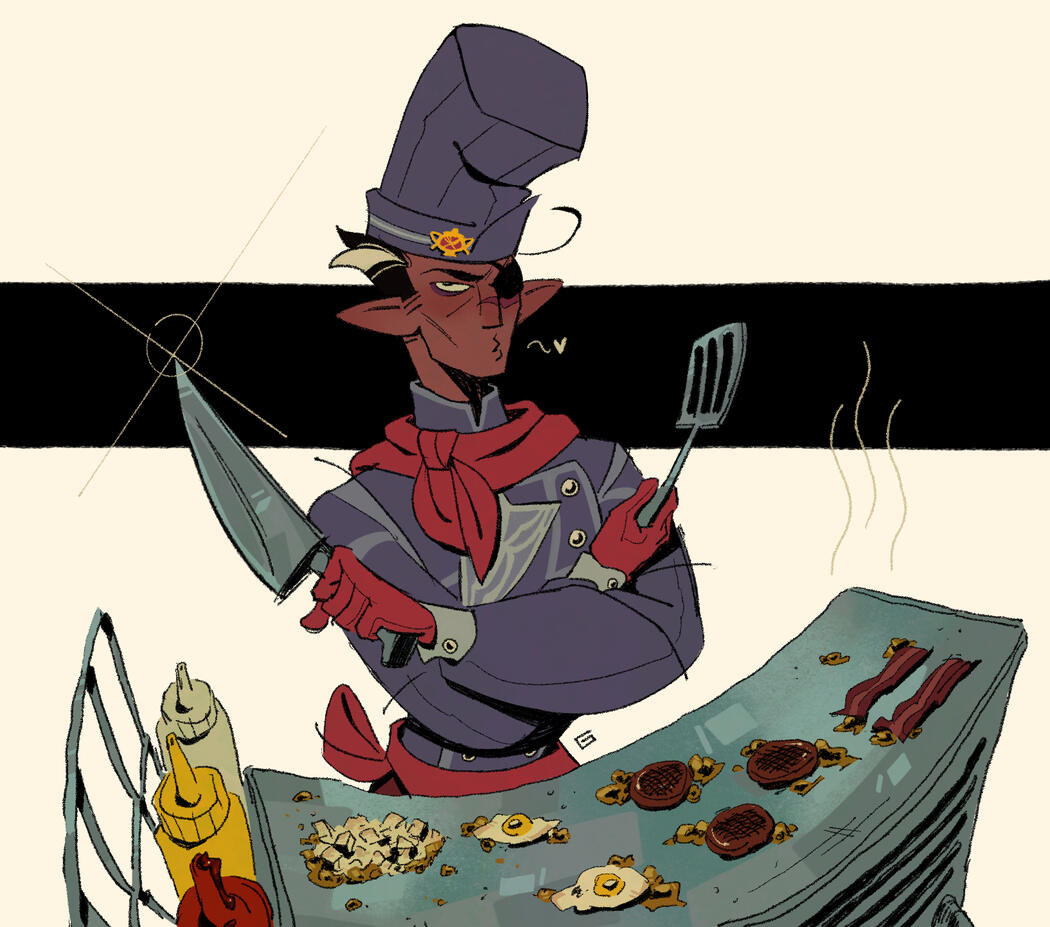 Although he runs his restaurants like they're the navy, Burgeaux is a bro at heart. He struggles with social interaction, often being more eager or energetic than what's considered “appropriate” with strangers and acquaintances. His flaws are his charms; he doesn’t carry himself seriously (outside of cooking) and would rather lackadaisically live life to its fullest rather than try and hold himself back in the clutches of despair.