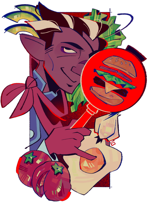 He’d heard the wails that emanated from the kitchen-- whispers of a rat fell upon keen duskwight ears– and he saw his chance to pull the trigger on Síntesis. Burgeaux was promptly stripped of his cooking license and the restaurant closed for the unforeseeable future.Burgeaux lost all his passion for living, staring lifelessly into the mirror as he applied burn cream to the intricately patterned scars that now decorated his body. It seemed as though he’d aged a decade in those few days afterward. All his hard work was gone in a haste, and the disconnect from his mind and body led him to operate on autopilot for three long years. Alcohol hung on his breath as he sunk into a deep depression– a part of himself lost from the inability to do what he loved, deprived of the respect he’d had from his peers before. He joined underground fighting rings just to make ends meet as his alcoholism worsened; but, word quickly spread and he quickly gained a loyal base of devotees as they’d remembered the donations once provided for them.Once on a walk to the arena, comrades by his side, he gained sudden awareness of his feelings and surroundings as he realized the overwhelming support for his fighting and what had gotten him there in the first place– his food! Although he desperately wanted to die, he realized couldn't cook in death and thus had to make the most of life. Why the hell did a license determine his food’s worth, and why did it stop him from cooking to his heart’s content!? Using his newly gained fighting skills and revitalized passion, he set off to get his life back together.